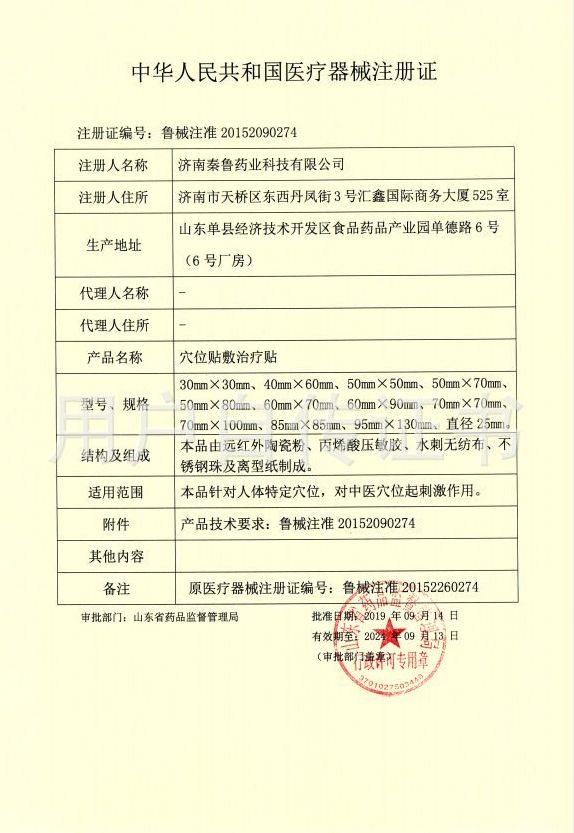 | 补充说明 | 【禁忌症】孕妇、皮肤溃烂处慎用 【慎用】糖尿病。高热患者 【注意事项】仅限一次性使用,用后销毁;叮嘱患者定时按压,按压不能过度用力以不损伤皮肤为宜;无粘性、包装破损或过有效期禁止使用。服帖后如有过敏等不适,应停止敷贴 【执行标准】YZB鲁0096-2015 【注册证号】鲁械注准20152260274 |