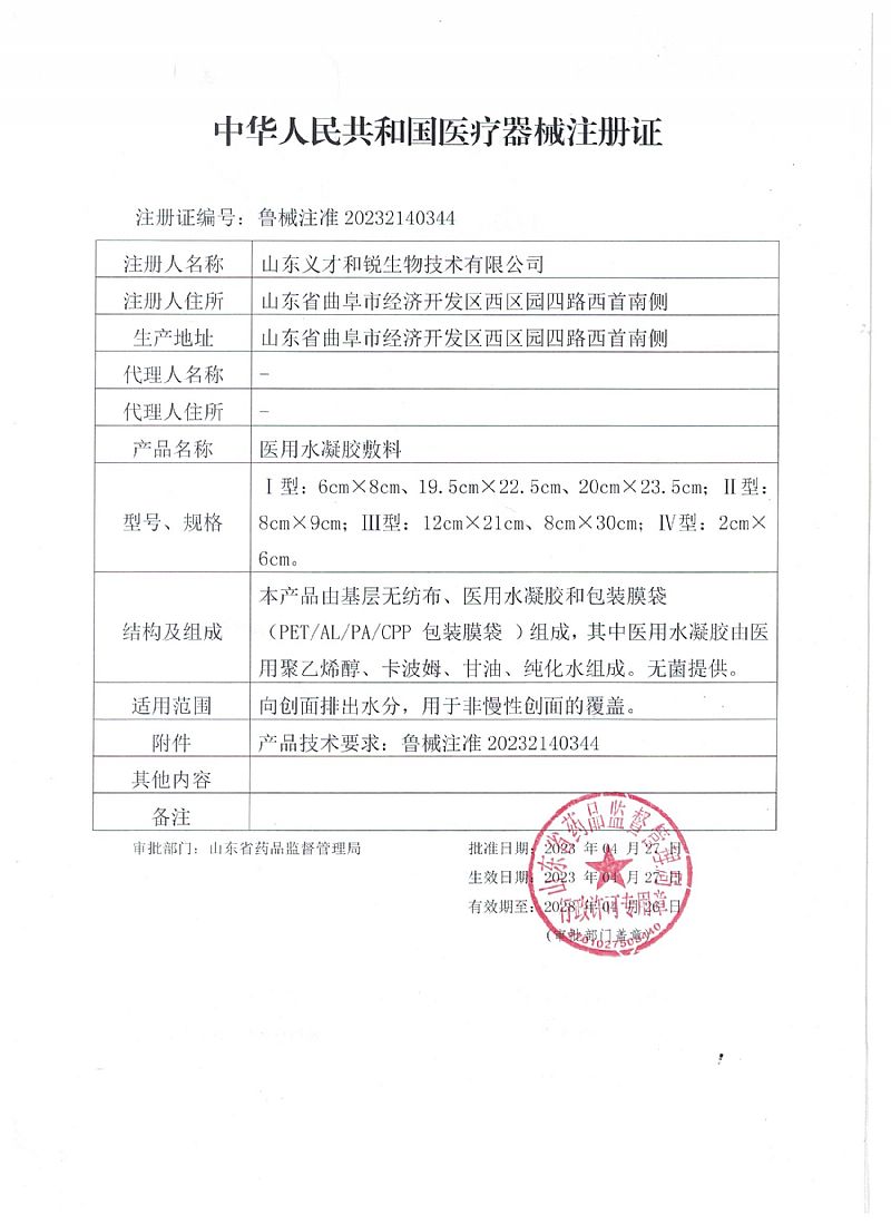 | 使用方法 | 外用:1.使用本品前,请先清洁和消毒伤口; 2.清洗双手,确认包装无破损后拆开内包装袋,取出产品; 3.撕下薄膜,按伤口轮廓将产品贴上,然后轻轻拍打,使其贴紧湿敷15-30分钟/次,每天1-3次,或遵医嘱。 |
