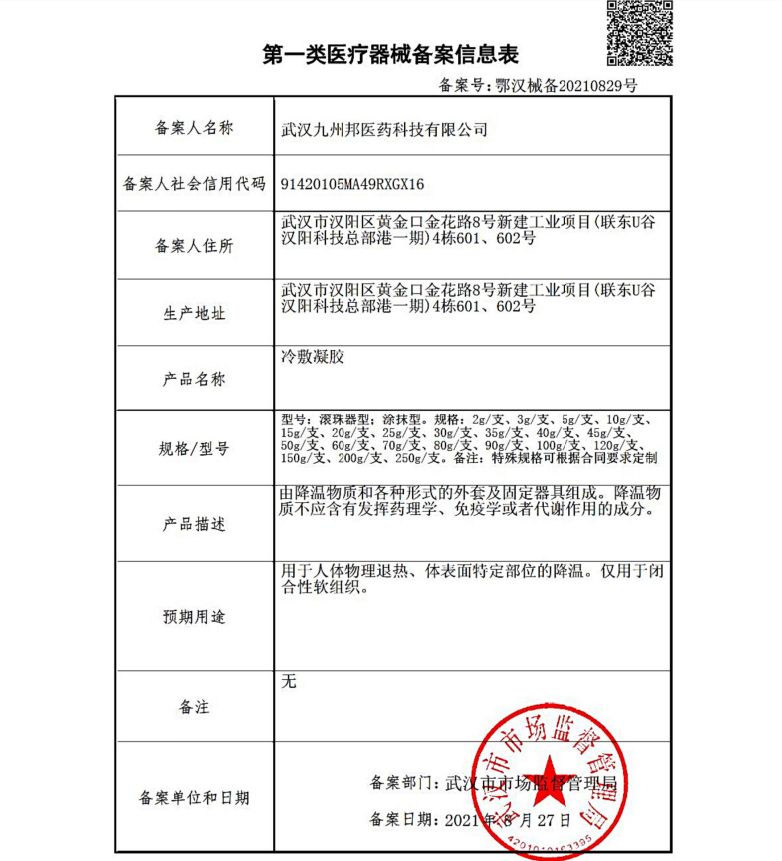 | 产品用途 | 用于人体物理退热、体表面特定部位的降温。仅用于闭合性软组织。 |