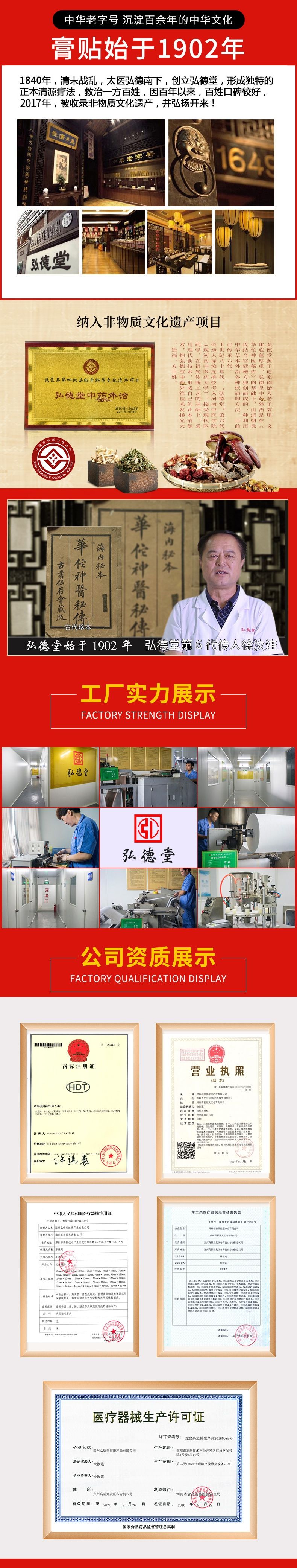 | 其它说明 | 郑州弘德堂健康产业有限公司,成立于2006年,是一家从事生物医药、医疗器械、卫生用品、消毒产品、化妆品、保健用品的高科技企业,2012年成立了自己的专业研发公司“郑州众仁医疗器械研究院有限公司”,公司集科研、生产、销售、经营于一体,拥有经河南省食品药品监督管理局检测验收的十万级生产车间。 公司位于中部美丽的城市--郑州市高新技术产业开发区,拥有一批科研、管理、营销方面的**人才,建立了独立的研发中心和销售中心;近年来,先后荣获多项荣誉--“中国优质产品”、二类医疗器械生产许可证、医疗器械经营许可证、消毒产品生产许可证、化妆品生产许证和多个产品批件。开发出二十余种有独立知识产权的健康精品。 郑州弘德堂健康产业有限公司秉承“弘医济生,德泽天下”的经营理念,本着“一切为了患者健康”的经营宗旨。始终把质量放在首位,公司所用原材料,均选自天然无污染的中药生产基地或进口原料。巨资引进先进的超临界萃取技术,使药材的生物活性大大提高。 “但愿人间无疾病,何愁架上药生尘”,弘德堂人,以“思利及人,康泽社会”为宗旨,以患者健康为己任,造就百姓信赖的健康精品,愿为广大消费者提供质优的产品和服务。 专业从事膏药贴剂类、膏剂、粉剂、油剂、液体等产品的生产加工、招商代理。可加工产品:远红外贴、肚脐贴、前列腺贴、痔疮贴、肠胃贴、腹泻贴、感冒贴、退热贴、巴布贴、黑膏药、暖宫贴、乳腺贴、咳喘贴、传统手工膏药等等。膏药专家弘德堂,贴贴更健康! |