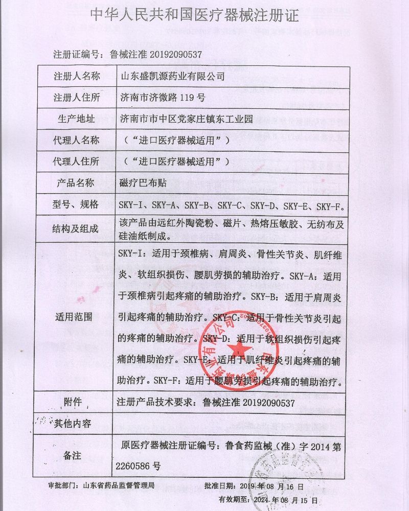 | 补充说明 | 【产品名称】磁疗巴布贴 【产品型号】 SKY-B 【产品规格】 6cm×9cm 【结构性能】本产品由远红外陶瓷粉、磁片、热熔压敏胶、无纺布及硅油纸制成。 1、剥离强度不小于1.0 N/cm。 2、持粘性不大于2.5 mm。 3、在远红外线波段8~15um范围内,法向比发射率:不低于0.75。 4、磁感应强度应在0.08T~0.10T范围内。 【适用范围】适用于肩周炎引起疼痛的辅助治疗。。 【使用方法】外用,疼痛点(阿是穴)贴敷。清洁患处,取出巴布贴揭开防粘层,将胶面贴于患处,轻轻按压即可,每 24小时更换一次,7-10天为一个疗程。使用时或遵医嘱。 【禁 忌 症】 1.金属异物局部; 2.心脏起搏器局部及其邻近; 3. 严重的心、肝、肺、肾衰竭的患者; 4.出血及有出血倾向者; 5.孕妇下腹部; 6.对磁疗有明显不良反应者; 7.体质极度虚弱者; 8.临床试验中提出的其他禁忌症。 【注意事项】对机体内装有起搏器者、植入金属物品患者、孕妇慎用。 |
