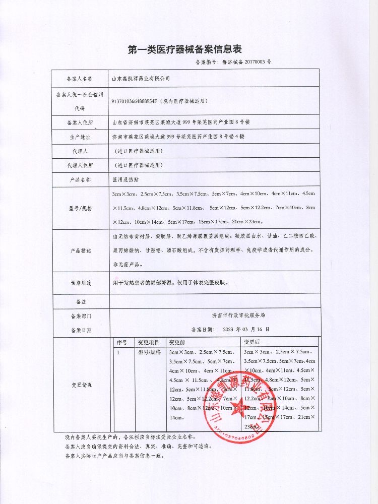 | 补充说明 | 【产品名称】医用退热贴 【型号/规格】 3 cm× 3cm 、 2.5cm × 7.5cm 、 3.5cm × 7.5cm 、 5cm × 7cm 、 4cm × 10cm 、 4cm× 11cm 、 4.5cm × 11.5cm 、 4.8cm × 12cm 、 5cm × 11.8cm 、 5cm × 12cm 、 5cm× 12.2cm 、 7cm × 10cm 、 8cm × 12cm 、 10cm × 14cm 。 【产品描述】由无纺布背衬层、凝胶层、聚乙烯薄膜覆盖层组成。凝胶层由水、甘油、乙二胺四乙酸、聚丙烯酸钠、甘羟铝、酒石酸组成,不含有发挥药理学、免疫学或者代谢作用的成分。非无菌产品。 【预期用途】用于发热患者的局部降温。仅用于体表完整皮肤。 【儿童用药】 【使用说明】打开包装袋,取出退热贴,揭开覆盖层,贴敷于需降温部位,每天1-3次,每贴可持续使用8小时。冷藏后使用效果更佳。 【注意事项】本品为外用贴剂,请勿误食;孕妇慎用,儿童须在成人监督下使用;使用中若有不适或偶有皮肤发红,停用后可消失;若有少量的膏体粘附皮肤,拭去即可。 【禁 忌 症】对本产品所含成分过敏者禁用。 【有 效 期】24个月 【贮 藏】密封,贮藏于干燥、通风的室内。 【生产备案编号】鲁济食药监械生产备20140021号 【产品备案凭证号】鲁济械备20170003号 更多 医用退热贴清凉因子 |