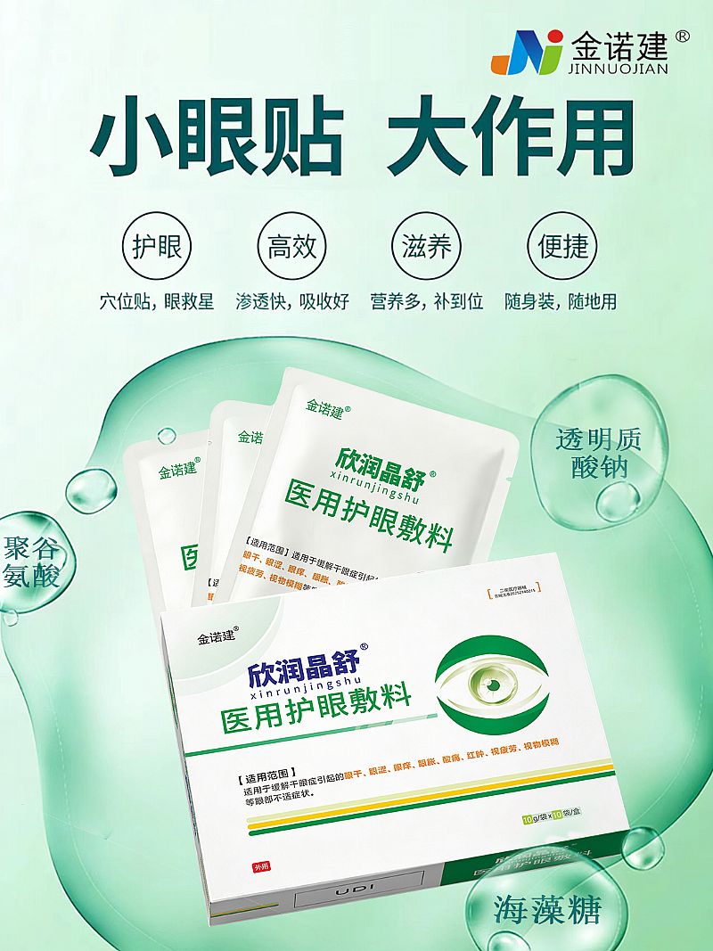 | 补充说明 | 【产品名称】医用护眼敷料 【型号、规格】A型(异形):A2d:17.5cm:10g/袋 【注册人及生产企业名称】吉林省国大生物制药有限公司 【住所及生产地址】吉林省长春市北湖科技开发区航空街3999号-2 【售后服务单位】吉林省国大生物制药有限公司 【联系方式】0431-81998331 【邮政编码】130000 【生产许可证编号】吉药监械生产许20190011号 【医疗器械注册证编号】吉械注准20252140215 【产品技术要求编号】吉械注准20252140215 【产品性能】本品应为无色至淡黄色,无异物,无杂质。其他详见产品技术要求。 【结构及组成】A型由甘油、海藻糖、卡波姆、三乙醇胺、透明质酸钠、聚谷氨酸、依地酸二钠、纯化水 、无纺布、铝塑袋组成。 【适用范围】适用于缓解干眼症引起的眼干、眼涩、眼痒、眼胀、酸痛、红肿、视疲劳、视物模糊等眼 部不适症状。 【使用方法】产品使用时需闭眼,使用前清洁眼周皮肤表面,取本品贴敷于眼部皮肤表面或涂抹于 眼周皮肤表面,每天2~3次,每次15~20分钟。 【禁忌症】1.皮肤过敏者慎用或者禁用。2.皮肤破损、红肿者禁用。3.孕妇禁用、开放性伤口禁用。 【注意事项】1 .本品仅供外用,不得内服。包装破损切勿使用。2.使用前请仔细阅读说明书,在产品 使用期限内使用,超过使用期限禁止使用。3.本品极少发生过敏反应,一旦出现过敏反应,立即停 用本品。4.使用时若不慎入眼刺激眼部,用大量清水冲洗即可。5.本品无菌,本品为一次性使用产 品 。 【灭菌方式】本品为Co60灭菌。 |