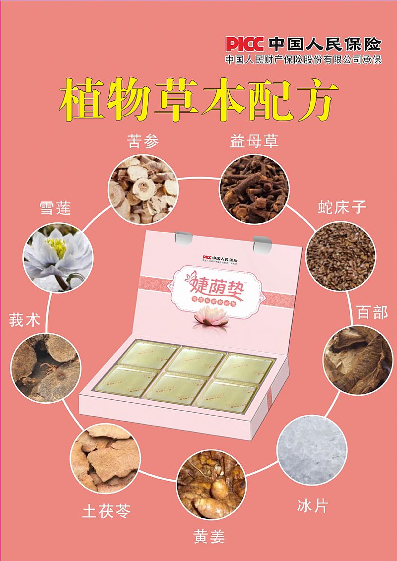 | 主要成分 | 雪莲(FlosSaussureae)、苦参(RadixSophoraeFiavescentis)、益母草(HerbaLeonuri)、百部(RadixStemonae)、蛇床子(FructusCnidii)、黄姜(RhizomaCurcumaeLongae)、莪术(RhizomaCurcumae)、土茯苓(RhizomaSmilacisGlabrae)、冰片 |