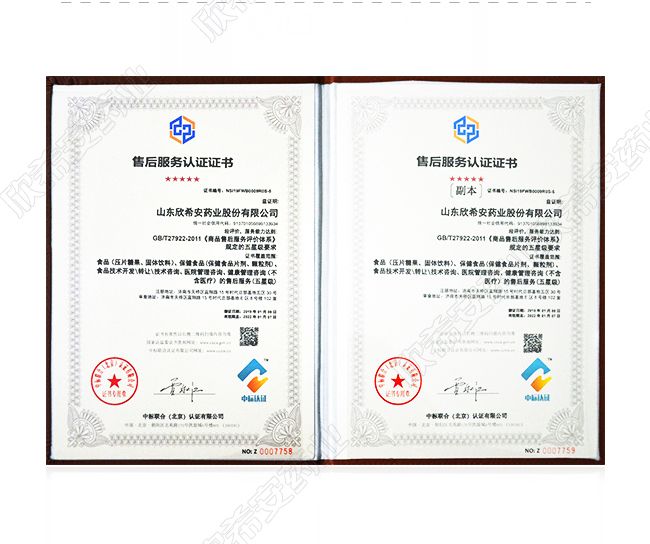 | 补充说明 | 山东欣希安药业股份有限公司成立20多年,是一家集天然功能食品、保健食品、特医食品研发、生产和销售于一体的国家级高新技术企业,是第四代蛋白锌硒技术的开创者。先后获得国家高新技术企业认证、知识产权管理体系认证、5星售后服务认证、中国星品牌、消费者满意品牌。 自有生产基地 品质有保障,公司拥有十万级净化生产车间,片剂、粉剂、胶囊剂等多条生产线,现代化生产设备、先进的检测仪器、美国反渗透纯化水设备,质检中心配有原子吸收分光光度计、原子荧光光谱仪、高效液相色谱仪等先进的检验仪器,为产品质量提供支持,公司视质量为企业的生存之本,严格按GMP要求组织生产,从原辅料采购到生产加工、检验等各环节严控质量,做到产品质量零缺陷,对消费者的健康负责。 通过市场监管局保健食品和食品双重生产许可认证。严格的质量管理体系认证,通过ISO9001、HACCP、ISO22000等多项质量管理体系认证。 |
