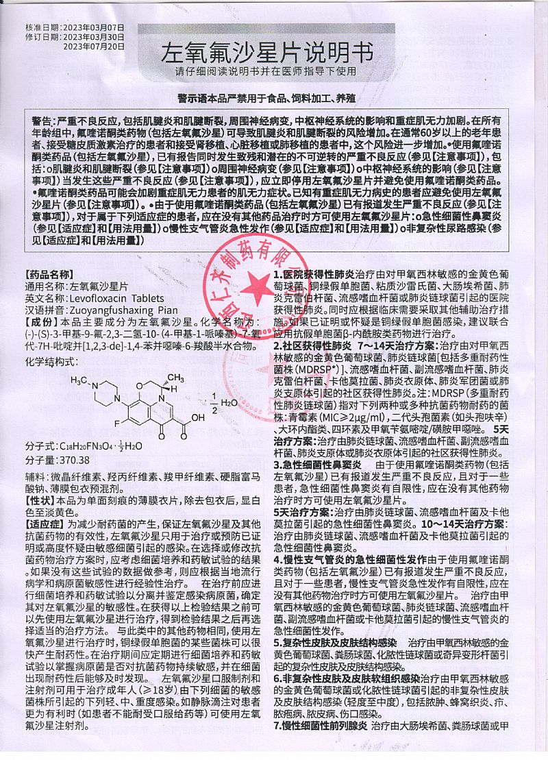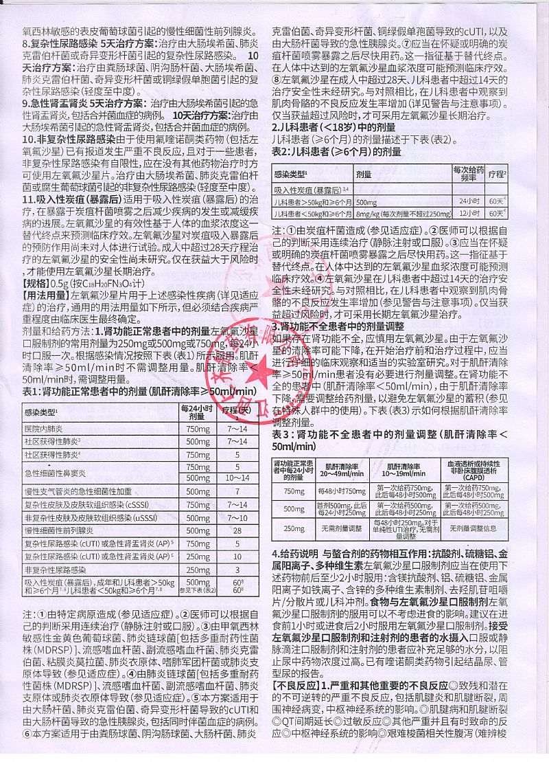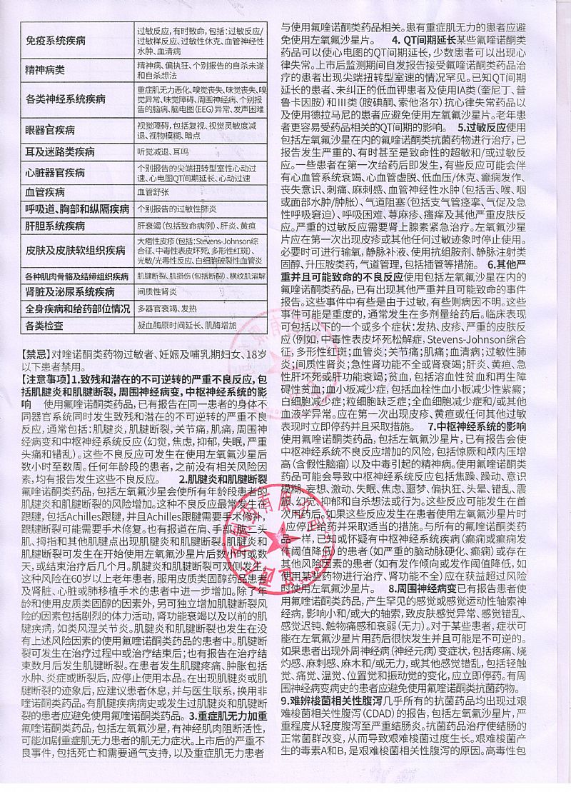 | 补充说明 | 【性状】本品为白色薄膜衣片,除去薄膜衣后显白色至淡黄色。 【禁忌】对本品及氟喹诺酮类药过敏的患者禁用。 【注意事项】 1.由于目前大肠埃希菌对氟喹诺酮类药物耐药者多见,应在给药前留取尿培养标本,参考细菌药敏结果调整用药。2.本品大剂量应用或尿pH值在7以上时可发生结晶尿。为避免结晶尿的发生,宜多饮水,保持24小时排尿量在1200ml以上。3.肾功能减退者,需根据肾功能调整给药剂量。4.应用本品时应避免过度暴露于阳光,如发生光敏反应或其他过敏症状需停药。5.肝功能减退时,如属重度(肝硬化腹水)可减少药物清除,血药浓度增高,肝、肾功能均减退者尤为明显,均需权衡利弊后应用,并调整剂量。6.原有中枢神经系统疾患者,例如癫痫及癫痫病史者均应避免应用,有指征时需仔细权衡利弊后应用。7.偶有用药后发生跟踺炎或跟踺断裂的报告,如有上述症状发生,须立即停药,直至症状消失。 【不良反应】1.胃肠道反应:腹部不适或疼痛、腹泻、恶心或呕吐。2.中枢神经系统反应可有头昏、头痛、嗜睡或失眠。3.过敏反应:皮疹、皮肤瘙痒,偶可发生渗出性多形性红斑及血管神经性水肿。光敏反应较少见。4.偶可发生:(1)癫痫发作、精神异常、烦躁不安、意识混乱、幻觉、震颤。(2)血尿、发热、皮疹等间质性肾炎表现。(3)静脉炎。(4)结晶尿,多见于高剂量应用时。(5)关节疼痛。5.少数患者可发生血清氨基转移酶升高、血尿素氮增高及周围血象白细胞降低,多属轻度,并呈一过性。 【孕妇及哺乳期妇女用药】动物实验未证实喹诺酮类药物有致畸作用,但对孕妇用药进行的研究尚无明确结论。鉴于本药可引起未成年动物关节病变,故孕妇禁用,哺乳期妇女应用本品时应暂停哺乳。 【儿童用药】本品在婴幼儿及18岁以下青少年的**性尚未确定。但本品用于数种幼龄动物时,可致关节病变。因此不宜用于18岁以下的小儿及青少年。 【老年用药】老年患者常有肾功能减退,因本品部分经肾排出,需减量应用。 【药理毒理】本品具有广谱抗菌作用,抗菌作用强,对多数肠杆菌科细菌,如大肠埃希菌、克雷伯菌属、变形杆菌属、沙门菌属、志贺菌属和流感嗜血杆菌、嗜肺军团菌、淋病奈瑟菌等革兰阴性菌有较强的抗菌活性。对金黄色葡萄球菌、肺炎链球菌、化脓性链球菌等革兰阳性菌和肺炎支原体、肺炎衣原体也有抗菌作用,但对厌氧菌和肠球菌的作用较差。本品为氧氟沙星的左旋体,其体外抗菌活性约为氧氟沙星的两倍。其作用机制是通过抑制细菌DNA旋转酶的活性,阻止细菌DNA的合成和复制而导致细菌死亡。 【药代动力学】口服后吸收完全,相对生物利用度接近100%。单剂量空腹口服0.1g和0.2g后,血药峰浓度(Cmax)分别达1.36mg/L和3.06mg/L,达峰时间(Tmax)约为1小时。血消除半衰期(t1/2β)约为5.1~7.1小时。蛋白结合率约为30%~40%。本品吸收后广泛分布至各组织、体液,在扁桃体、前列腺组织、痰液、泪液、妇女生殖道组织、皮肤和唾液等组织和体液中的浓度与血药浓度之比约在1.1~2.1之间。本品主要以原形自肾排泄,在体内代谢甚少。口服48小时内尿中排出量约为给药量的80%~90%。本品以原形自粪便中排出少量,给药后72小时内累积排出量少于给药量的4%。 【贮藏】遮光,密封保存。 |