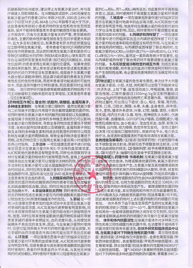| 药物相互作用 | 螯合剂: 抗酸剂、硫糖铝、金属阳离子、多种维生素制剂左氧氟沙星口服制剂 虽然左氧氟沙星与二价阳离子的螯合作用弱于其他氟喹诺酮类抗生素,但同时使用左氧氟 沙星口服制剂和抗酸剂如镁或铝以及硫糖铝、金属阳离子例如铁及含锌的多种维生素制剂仍可以影响左氧氟沙星的胃肠吸收,导致全身药物浓度显著低于预期浓度。详见说明书 |