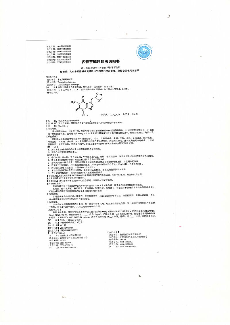 | 补充说明 | 【性状】本品为无色的澄明液体。 【禁忌】凡对多索茶碱或黄嘌呤衍生物类药物过敏者,急性心肌梗死患者禁用。 【注意事项】 1.茶碱类药物个体差异较大,多索茶碱剂量亦要视个体病情变化选择*佳剂量和用药方法。并监测血药物浓度。2.患有甲亢、窦性心动过速、心律失常者,请遵医嘱用药。3.严重心、肺、肝、肾功能异常者以及活动性胃、十二指肠溃疡患者慎用。4.本品不得与其他黄嘌呤类药物同时服用,建议不要同时饮用含***的饮料或食品。 【不良反应】使用黄嘌呤衍生物可能引起恶心、呕吐、上腹部疼痛、头痛、失眠、易怒、心动过速、期前收缩、呼吸急促、高血糖、蛋白尿。如过量使用还会出现严重心律失常、阵发性痉挛等。此表现为初期中毒症状,此时应暂停用药,请医生诊断,监测血药浓度。但在上述中毒迹象和症状完全消失后仍可继续使用。 【孕妇及哺乳期妇女用药】孕妇及哺乳期妇女尽量避免使用。 【儿童用药】尚无儿童有效及**性资料。 【老年用药】老年人患者对本品清除率可能会不同,应进行血药浓度监测。 【药理毒理】多索茶碱是甲基黄嘌呤的衍生物,它是一种支气管扩张剂,可直接作用于支气管,松弛支气管平滑肌。通过抑制平滑肌细胞内的磷酸二酯酶等作用,松弛平滑肌,从而达到抑制哮喘的作用。 【药代动力学】慢性支气管炎患者静脉注射多索茶碱100mg(注射时间超过10分钟),给药后血浆药物达峰时间(tmax)约为0.10小时,血药浓度峰值(Cmax)约为2.50μg/ml,消除半衰期(t1/2)约为1.83小时,能迅速分布到**体液和脏器,总清除率为683.6±197.8ml/分。进食可使峰浓度(Cmax)降低,达峰时间(tmax)延迟,宜增加本剂量。 【贮藏】密闭保存。 |