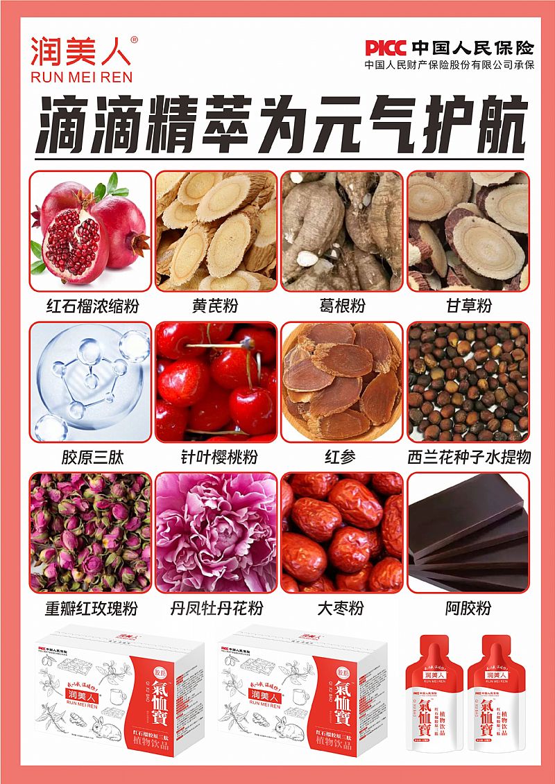 | 主要成分 | 饮用水、红石榴浓缩粉、黄芪粉、葛根粉、胶原三肽、针叶樱桃果粉、红参(5年及5年以下人工种植的人参)、重瓣红玫瑰粉、丹凤牡丹花粉、大枣粉、西兰花种子水提物、血蛋白低聚肽、阿胶粉、甘草粉、γ~氨基丁酸、茶叶茶氨酸、N-乙酰神经氨酸、羧甲基纤维素钠、三氯蔗糖、山梨酸钾 |