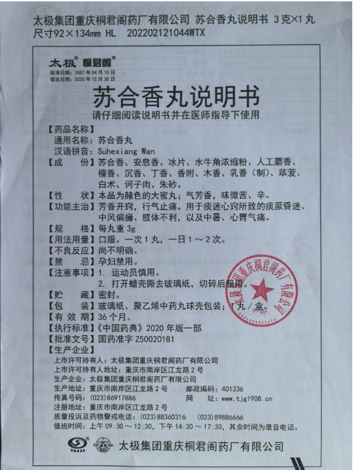 | 补充说明 | 【性状】本品为赭色的大蜜丸;气芳香,味微苦、辛。 【禁忌】孕妇禁用。 【注意事项】 服用前应除去蜡皮、塑料球壳;本品可嚼服,也可分份吞服。 【不良反应】尚不明确。 【贮藏】密封。 【执行标准】《中华人民共和国药典》2005 年版一部 |