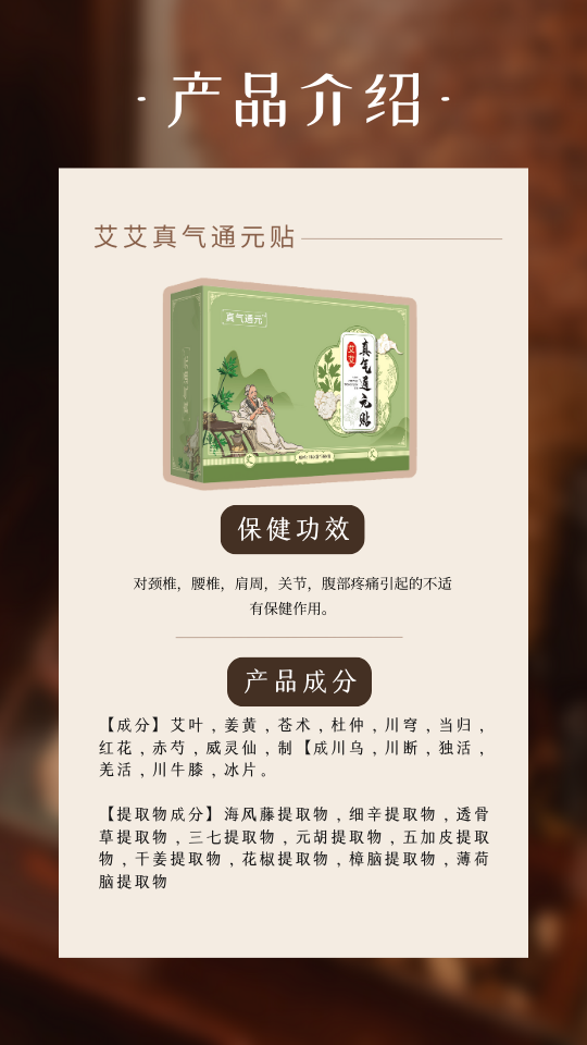 | 主要成分 | 艾叶、姜黄、仓术、干姜、杜仲、川穹、当归、红花、透骨草等 |