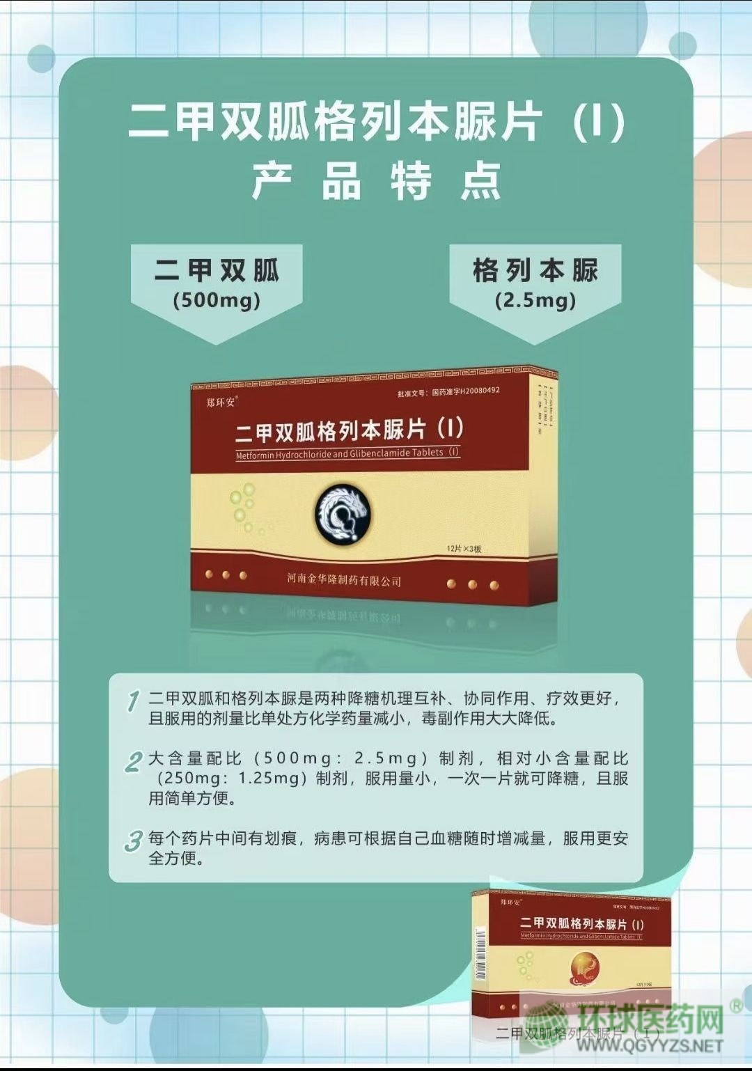 大含量(每片含盐酸二甲双胍500mg,格列本脲2.5mg) |