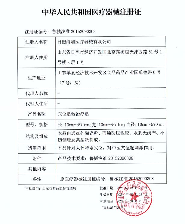 | 补充说明 | 【产品名称】穴位贴敷治疗贴 【主要结构】本品由远红外陶瓷粉、丙烯酸压敏胶、水刺无纺布、不锈钢珠及离型纸制成。 穴位贴敷治疗贴的压敏胶布剥离强度不小于1.0N/cm,持粘性应不大于2.5m远红外发射波长范围8μm-15μm,法向比辐射率≥75%。 【适用范围】本品针对人体特定穴位,对中医穴位起刺激作用。 【使用方法】清洁相应穴位,确认包装无破损后,打开包装,取出穴位贴敷治疗贴,将贴剂的隔离膜撕去,以钢珠对准相应穴位敏感点贴压,1片/穴、天。 【禁忌症】孕妇、皮肤溃烂处禁用。 【慎用】糖尿病、高热患者。 【注意事项】1、**一次性使用,用后销毁; 2、敷贴后如有过敏等不适,应停止敷贴。 【贮存】本产品应贮存在相对湿度不超过80%,无腐蚀性气体、阴凉、干燥、通风良好、清洁的环境。 |