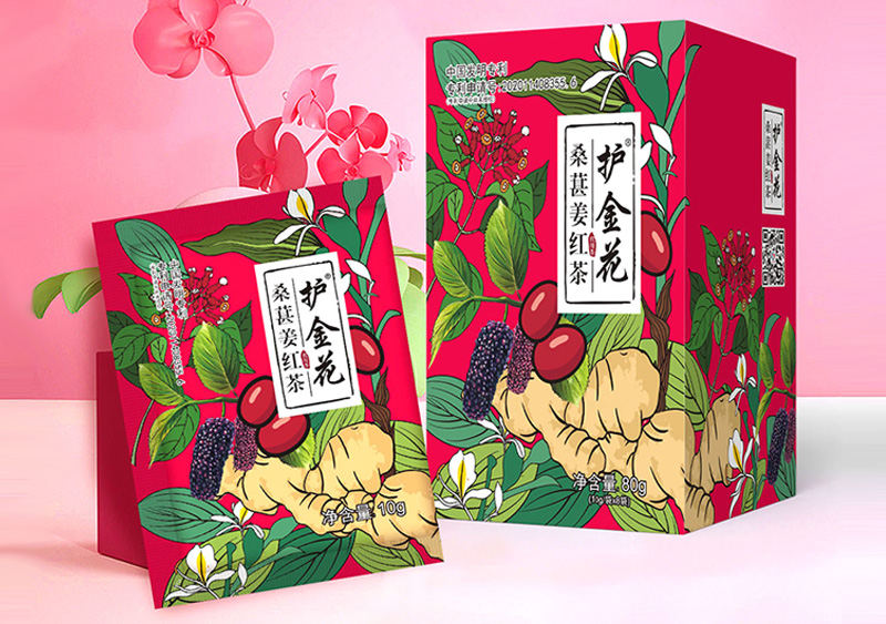 | 补充说明 | 【产品名称】:护金花 桑葚姜红茶 【产品规格】:5g/袋*7袋 【适用人群】:成年人人群。 【产品成分】:桑葚、蜂蜜、红糖、生姜、红枣、枸杞、丁香(桃金娘科)。 【食用建议】:开水泡服,每次1袋,每天1-2次。 |