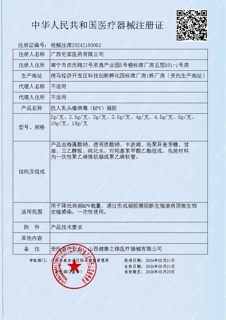 | 产品用途 | 用于降低局部HPV载量,通过形成凝胶膜阻断生殖道病原微生物定植感染。一次性使用。 |