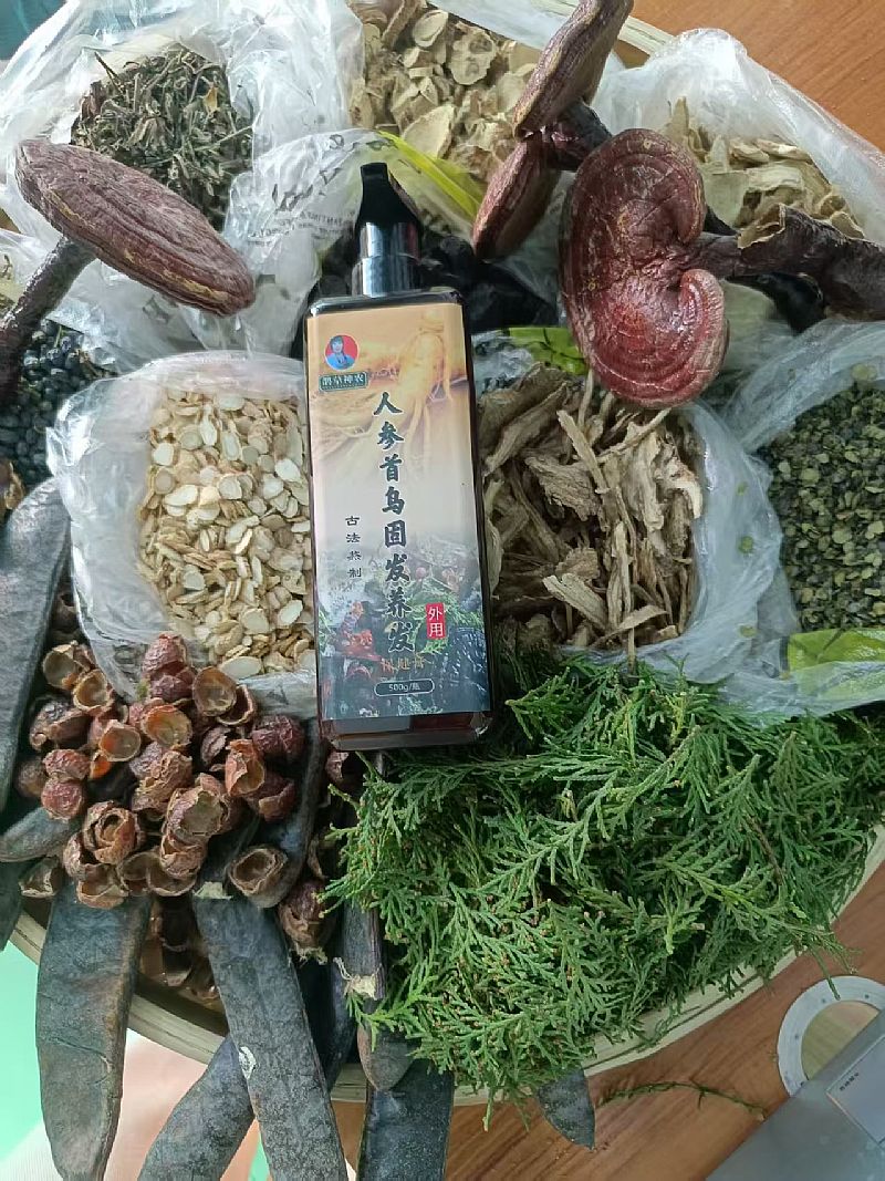 | 主要成分 | 人参、何首乌。黑灵芝、黄侧柏叶、无患子、皂角、山茶籽、墨旱莲、当归、苦参、桑葚、女贞子、甘草、水, |