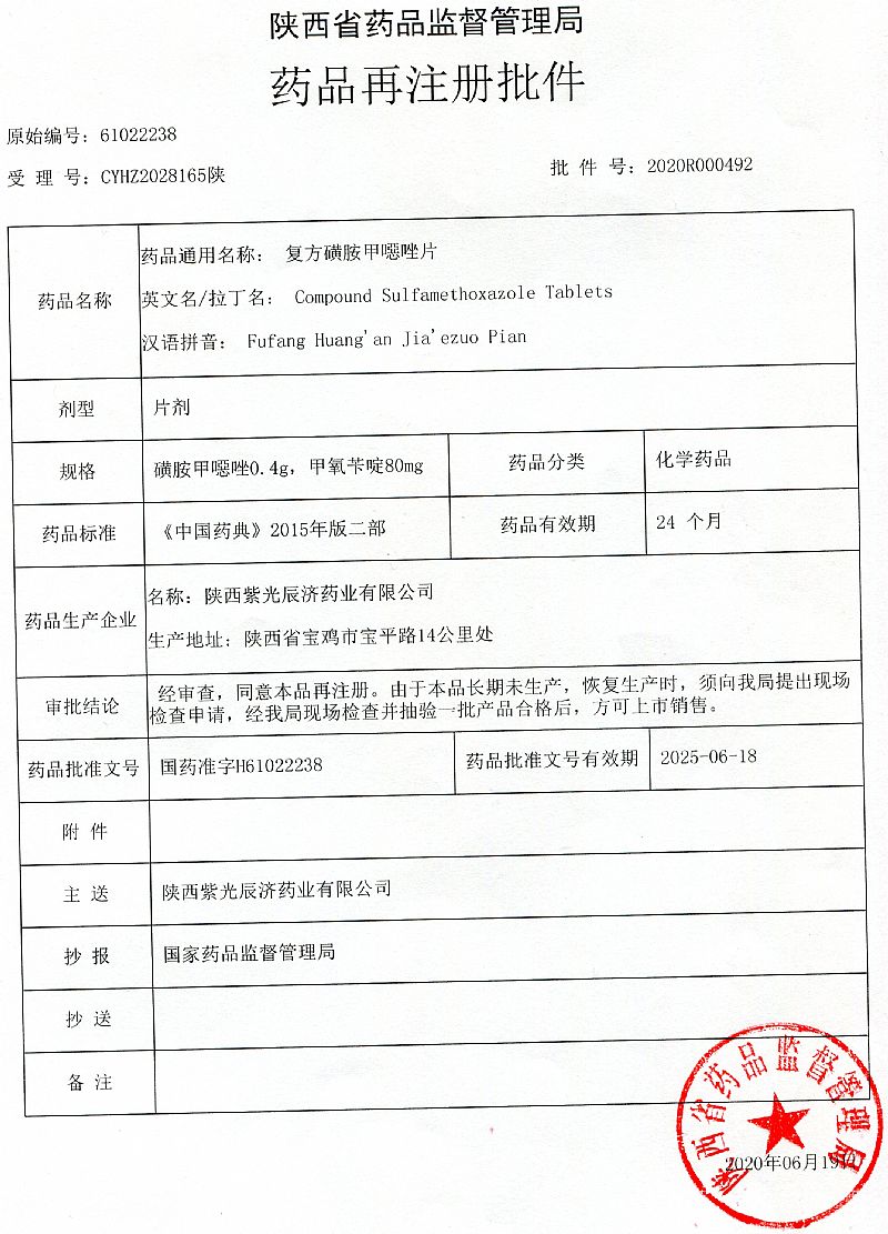 | 产品规格 | 每片含磺胺甲恶唑0.36-0.44g, 甲氧苄啶72.0-88.0mg |