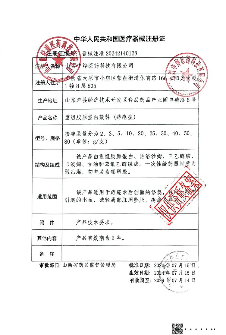 | 产品用途 | 适用于痔疮术后创面修复,可用于痔疮引起的出血减轻局部肛周坠胀疼痛及瘙痒。 |