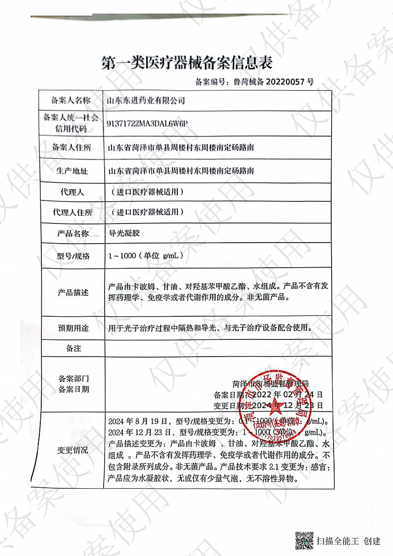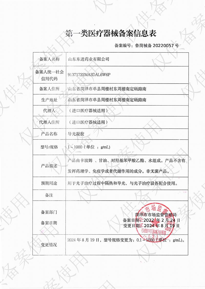 | 补充说明 | 【产品名称】导光凝胶 【型号规格】35g/瓶×1瓶/盒 【产品描述】产品由卡波姆、甘油、对羟基苯甲酸乙酯、水组成。产品不含有发挥药理学、免疫学或者代谢作用的成分。非无菌产品。 【预期用途】用于光子治疗过程中隔热和导光,与光子治疗设备配合使用。 【使用方法】外用,直接涂抹于患处。 【注意事项】 1、本品不属于药品; 2、 本品外用禁口服; 3、过敏体质者慎用; 4、 皮肤有开放性伤口、化脓或有明显渗出者禁用; 5、 请将本品放在儿童不能接触的地方; 6、 本品性状发生改变时禁止使用; 7、 使用本品后有不适症状者应停止使用或向医生咨询。 【禁忌症】对本品成分过敏者禁用。 【储存条件】密封、常温下贮存和运输,运输过程中轻拿轻放。 【备案凭证编号】鲁菏械备20220057号 【产品技术要求编号】鲁菏械备20220057号 【生产备案凭证编号】鲁菏食药监械生产备20170002号 |