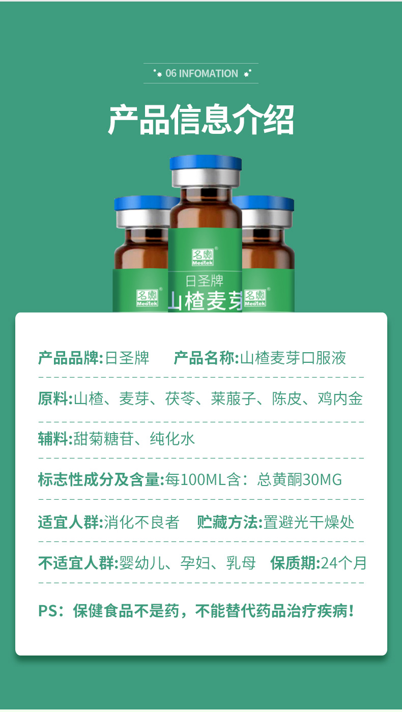 | 主要成分 | 原料:山楂、麦芽、茯苓、莱菔子、陈皮、鸡内金 辅料:甜菊糖苷、纯化水 |
