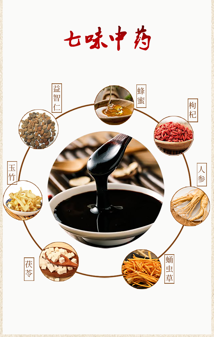 | 主要成分 | 白砂糖、蜂蜜、麦芽糖、人参(人工种植)、枸杞、茯苓、黄精、覆盆子、玉竹、佛手、益智仁、柠檬酸、蛹虫草 |