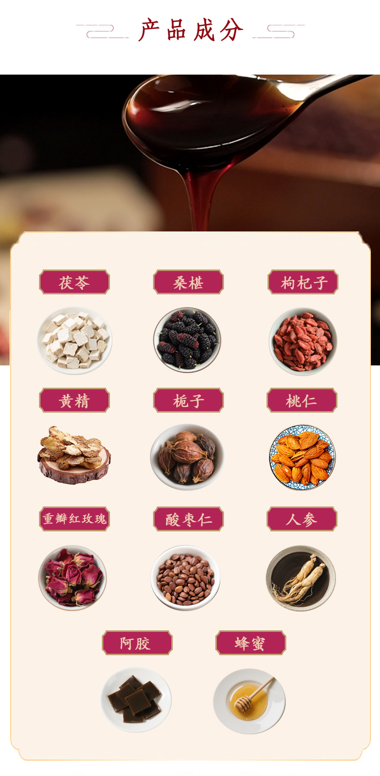 | 主要成分 | 麦芽糖、白砂糖、蜂蜜、茯苓、桑椹、黄精、枸杞、栀子、桃仁、玫瑰花(重瓣红玫瑰)、酸枣仁、人参(五年及五年以下人工种植)、阿胶、柠檬酸、乙二胺四乙酸铁钠 |