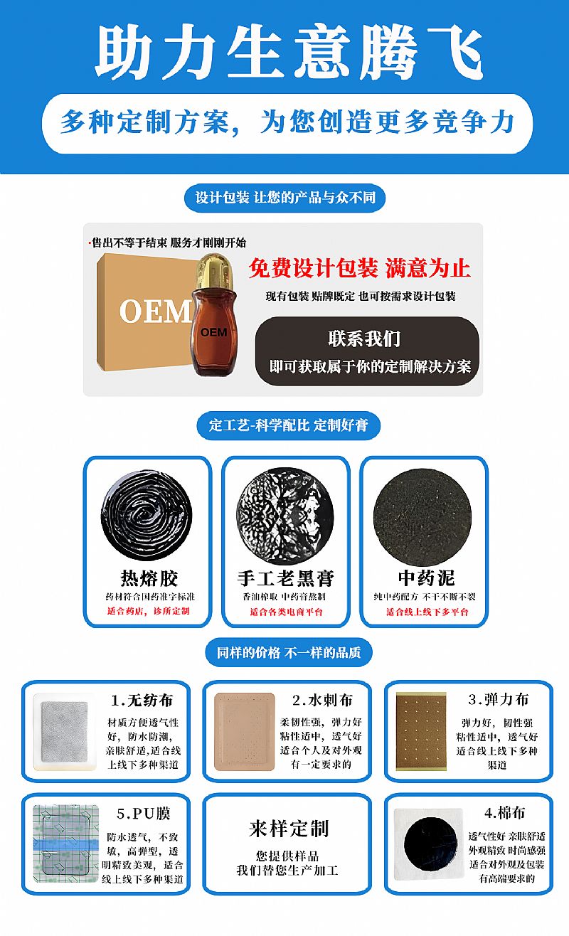 | 补充说明 | 主营膏药贴牌代加工,老黑膏药贴牌代加工,理疗贴代加工,治疗贴代加工,穴位贴代加工,小儿穴位贴代加工,穴位贴敷治疗贴代加工,远红外理疗贴代加工,磁疗贴代加工,热疗贴代加工,三伏贴代加工,暖宫贴代加工,远红外贴代加工,空白裸贴代加工,凝胶代加工,黑膏药贴代加工,发热包代加工,鼻炎喷雾剂代加工,鼻炎贴代加工,凝胶乳膏代加工,活络油代加工,前列腺贴代加工,灸热贴代加工,磁热疗贴代加工,隔物灸代加工,烫熨治疗贴代加工,热奄包代加工,磁灸热贴代加工,灸热治疗贴代加工,自热贴代加工,按摩精油代加工,精油代加工,膏药oem贴牌定制代加工,欢迎有需要膏药贴牌代加工的朋友来电13027787717咨询洽谈合作。 |