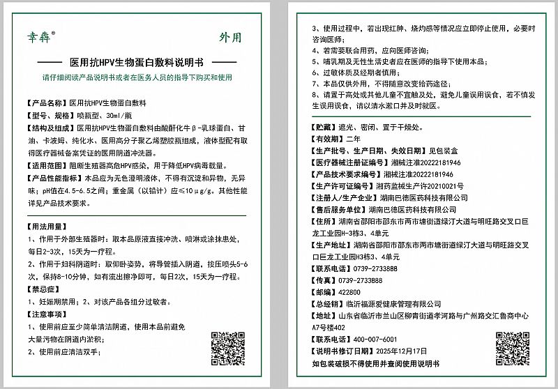 | 主要成分 | 医用抗HPV生物蛋白敷料由酸酐化牛β-乳球蛋白、甘油、卡波姆、纯化水、医用高分子聚乙烯塑胶瓶组成,液体型配有取得医疗器械备案凭证的医用阴道冲洗器。 |