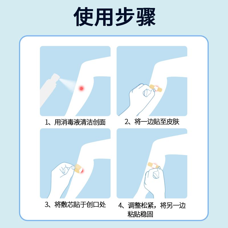 | 使用方法 | 【使用说明】 使用本品前,应先清洁和消毒伤口。 2、撕开包装纸,将附芯胶布对准伤口,先后把左右两边隔离层除去,并固定 位置 |