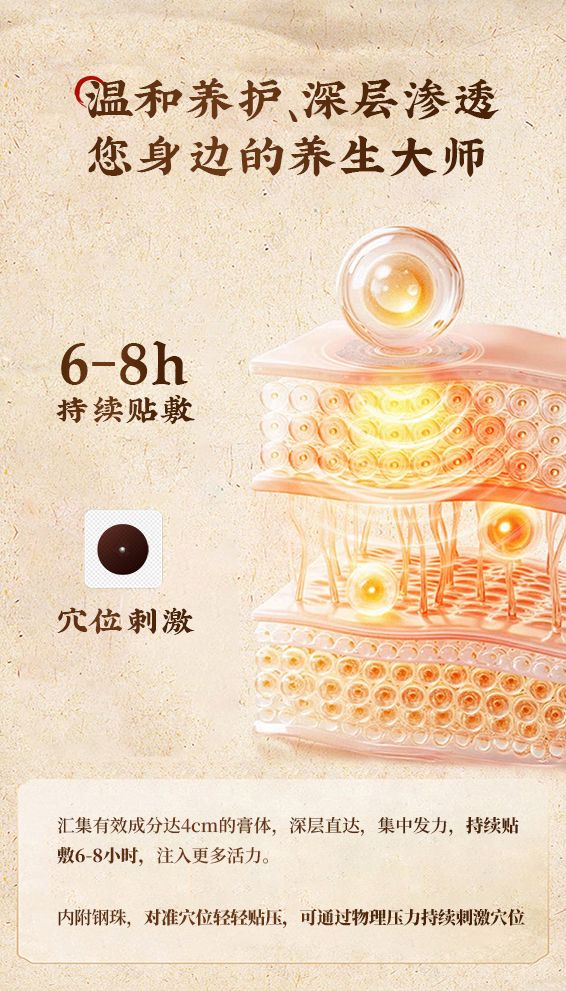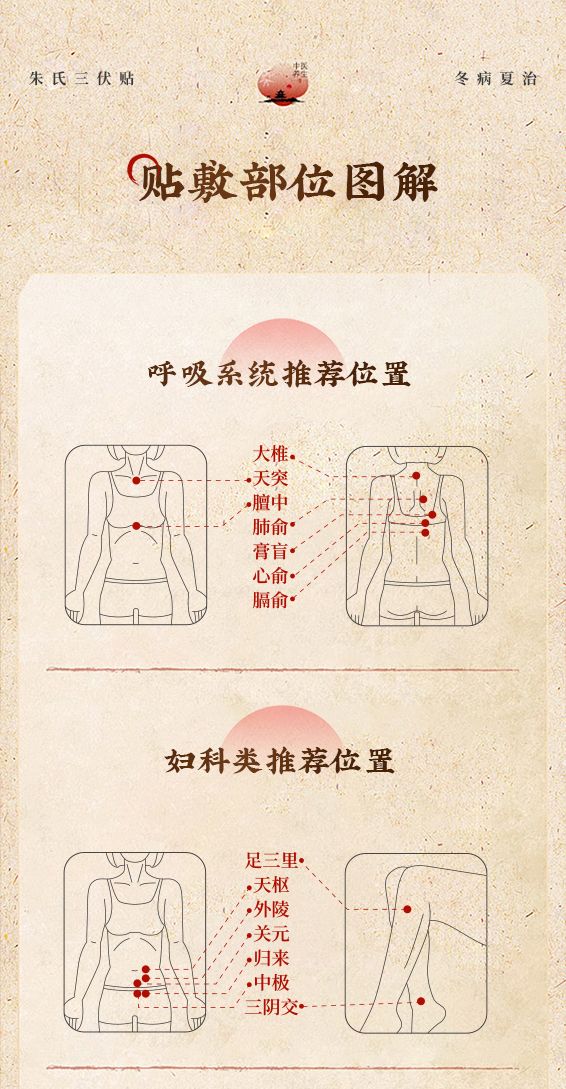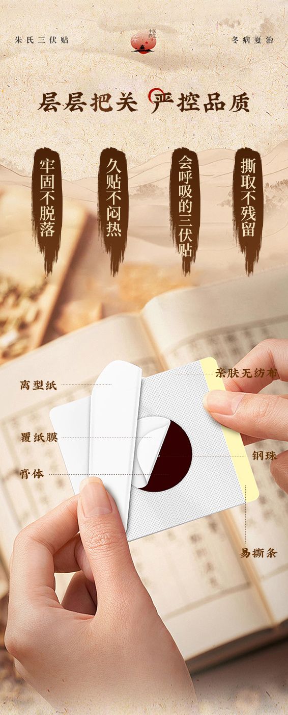 | 补充说明 | 现代医学机理 透皮吸收作用 皮肤角质层软化,草本有效成分透过皮肤黏膜吸收,局部起效,改善微循环。 局部物理温热刺激 贴敷产生温和热效应,扩张毛细血管、加快血流、促进代谢,减轻气道、关节、盆腔寒性炎症反应。 神经调节作用 穴位持续刺激神经末梢,调节自主神经功能,降低气道高反应、过敏反应,增强免疫调节。 三伏贴 适用人群 长期规律贴敷,可改善机体免疫力,降低过敏性鼻炎、咳喘、反复感冒的发病概率。 (针对虚寒体质人群) 呼吸系统人群 过敏性鼻炎、慢性咽炎、反复咳嗽、哮喘、换季易感冒、免疫力差。 骨关节人群 颈肩腰腿痛、老寒腿、风湿关节痛、遇冷酸痛、寒湿痹痛。 脾胃虚寒人群 脾胃虚弱、怕冷、腹胀便溏、受凉拉肚子、食欲差。 妇科亚健康人群 宫寒、手脚冰凉、经期小腹冷痛、体寒湿气重。 儿童体弱人群 小儿反复感冒、久咳、脾胃弱、虚寒易生病(3 岁以上适宜)。 二、三伏贴 禁忌人群(严禁使用) 孕妇、哺乳期女性; 2 岁以下婴幼儿(皮肤过嫩,禁止贴敷); 皮肤破损、溃疡、湿疹、皮炎、严重过敏体质; 发热、急性炎症、上火严重、阴虚火旺人群; 严重心脏病、糖尿病、严重肝肾疾病、体质极度虚弱者; 对白芥子、细辛、膏药胶布严重过敏者。 |